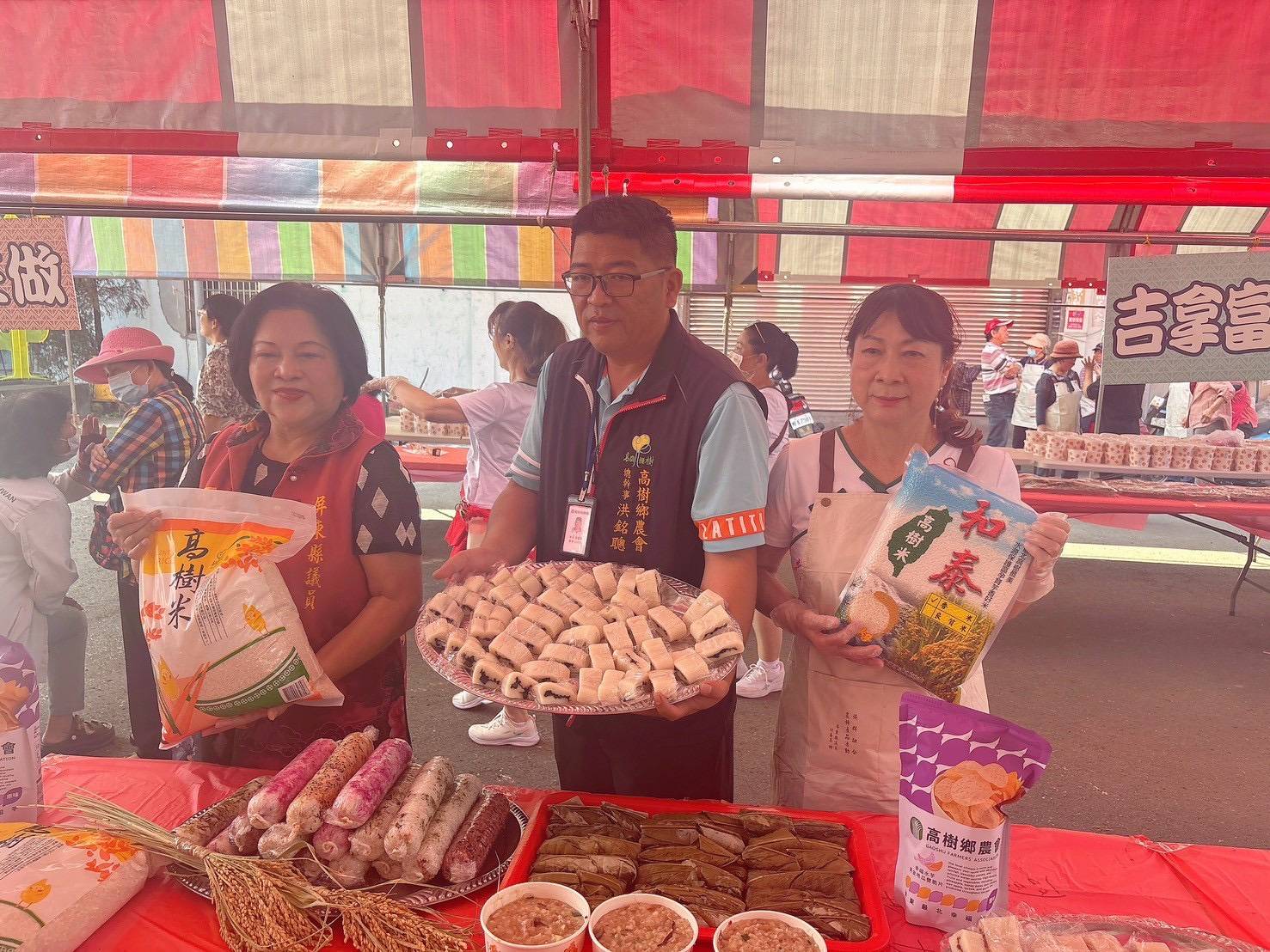 「族群融合合原鄉小米、吉拿富、阿拜、小米酒結合147米高樹芋樂豐年·風土傳四方」農特產推廣活動,22日上午在高樹鄉農會倉庫熱鬧展開。活動由屏東縣議員何春美服務處及高樹鄉婦女愛心協會共同主辦,結合高樹鄉公所、農會及各社區發展協會、社區關懷據點等多個單位,呈現跨族群、跨領域的在地文化盛會。