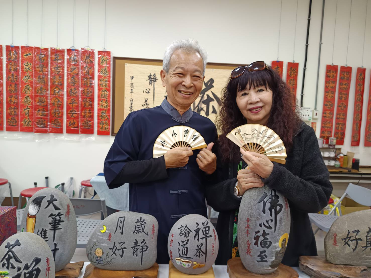 除了藝術的美感,展場更洋溢著人情溫度。久違的老朋友相見歡,彼此寒暄、交流創作心得,讓現場充滿溫暖氛圍。江敏英理事長更親手將大社區發行的月曆送到老師們手中,分享近況,傳遞祝福,這份心意正是藝術最美的風景之一。