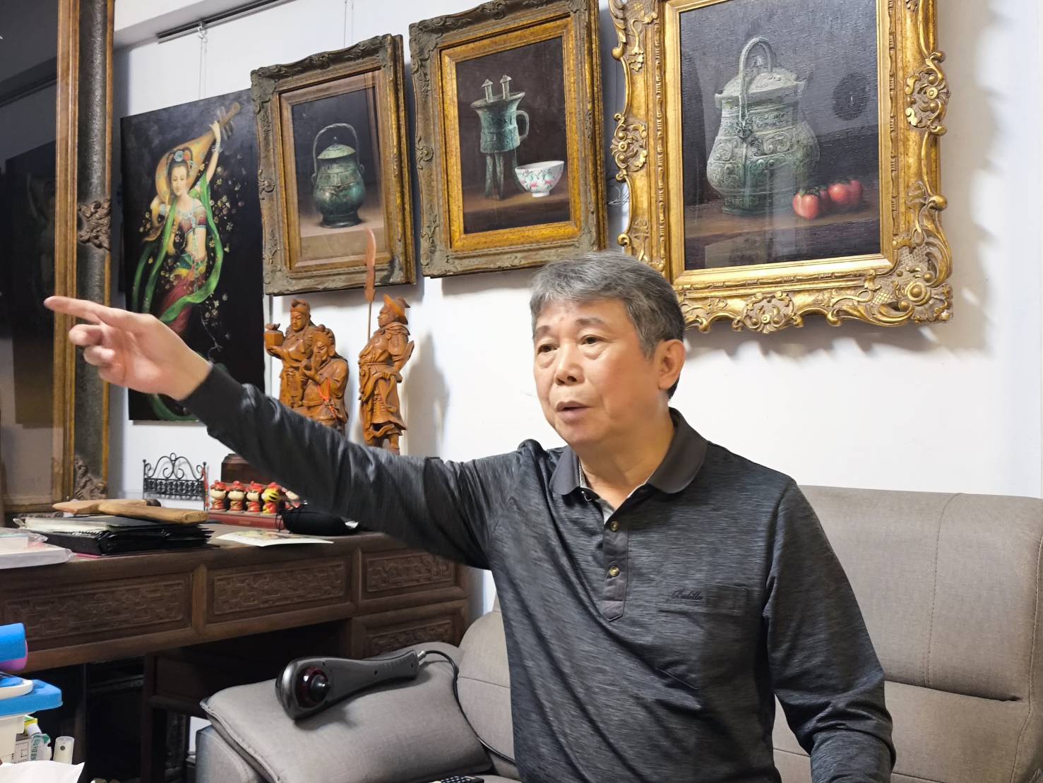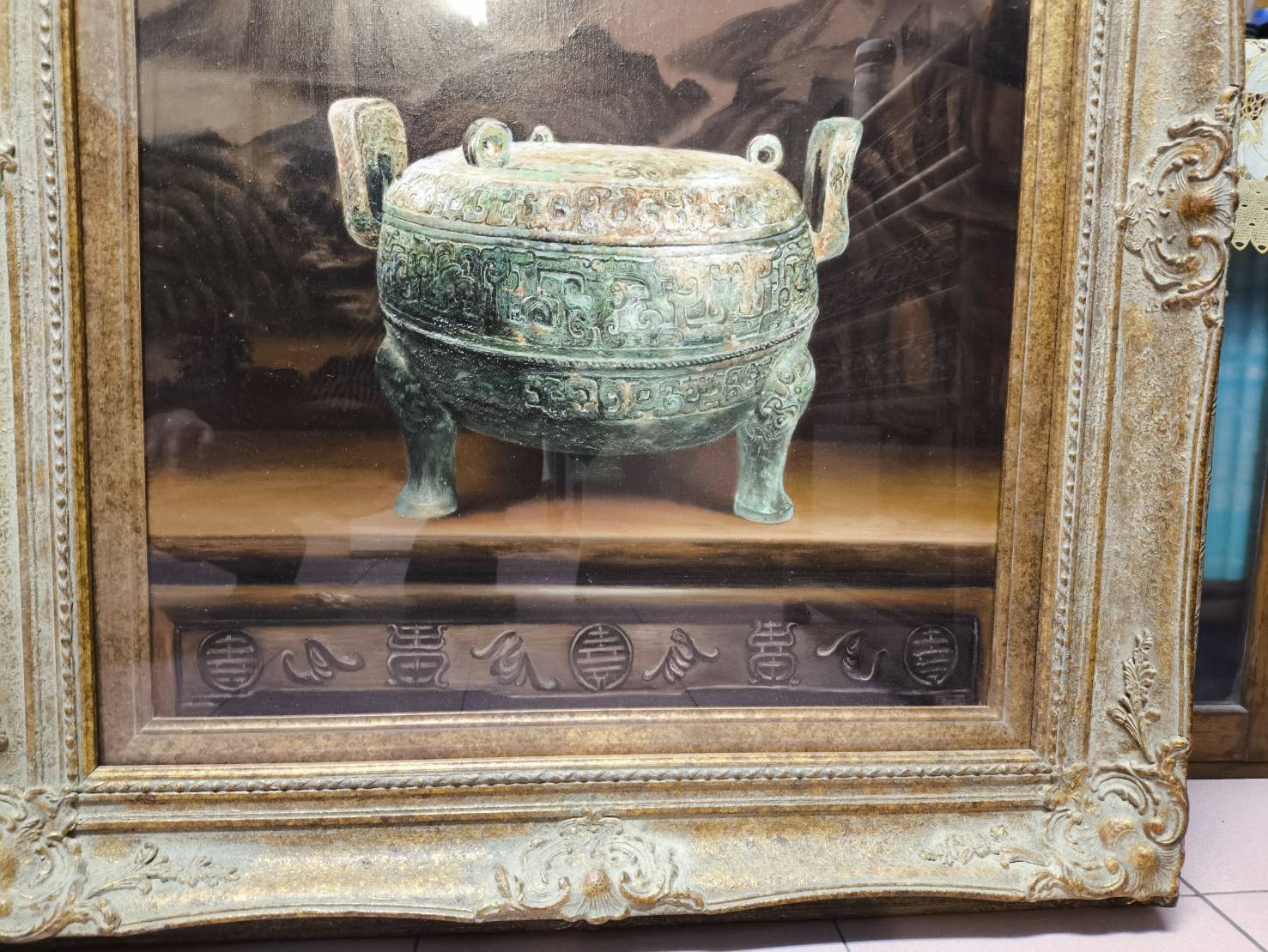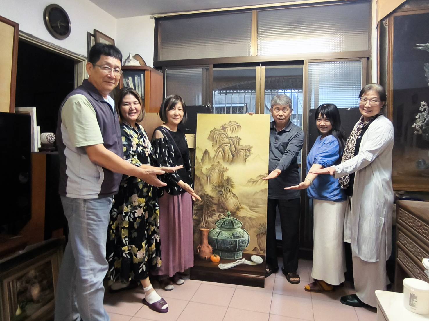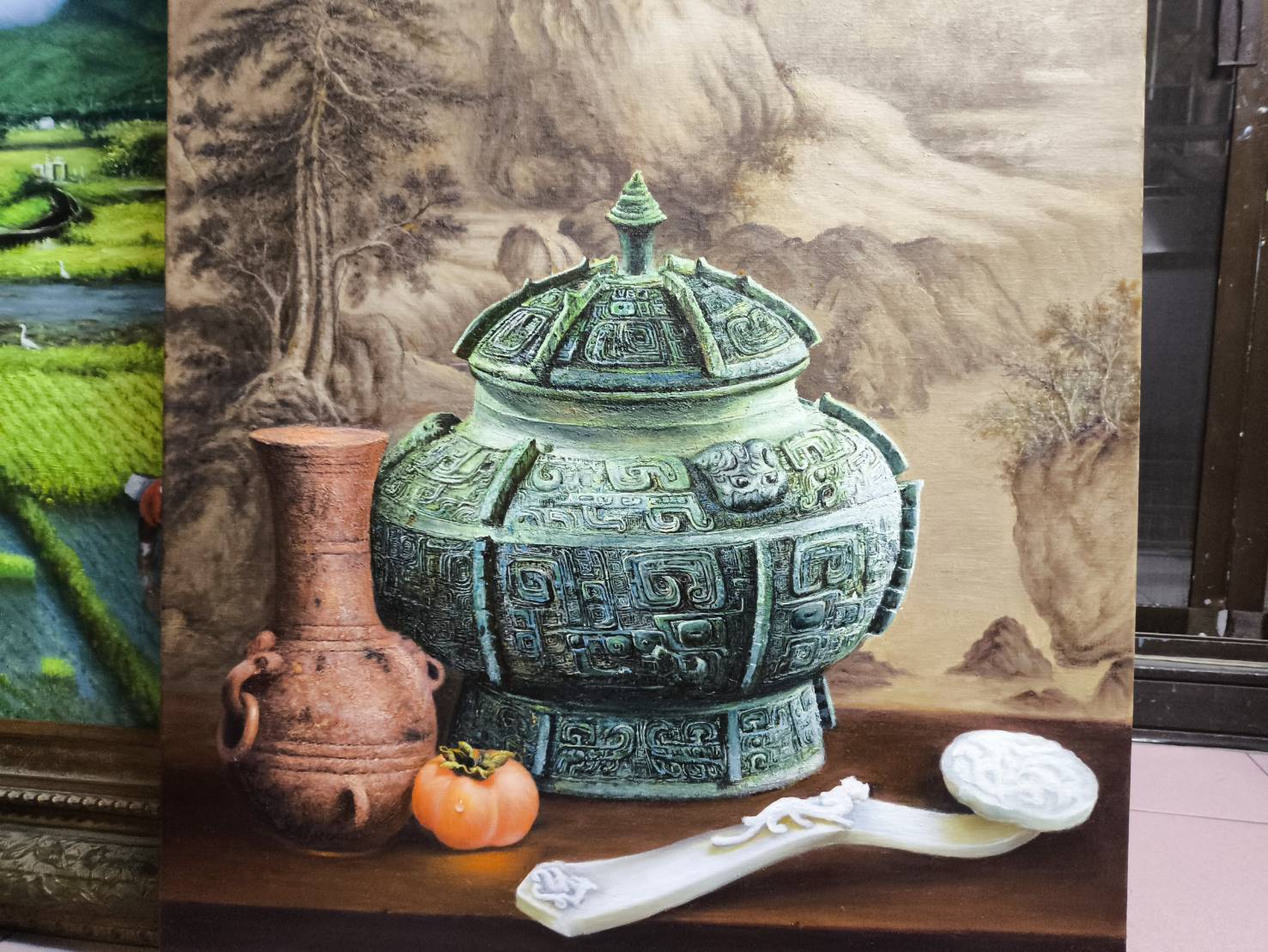 林惠修老師擅長古典寫實畫風,近年來更致力於創新,將具有文化價值的古樸器物(如青銅器)與圖騰融入畫作題材中。此次入選的作品即描繪了一件青銅器,背景結合國畫元素,展現出獨特的東方文化韻味與細膩的寫實技巧。